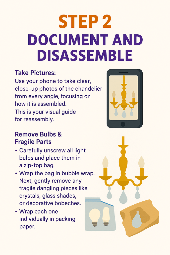 - Take Pictures: Before you unscrew a single thing, use your phone to take clear, close-up photos of the chandelier from every angle. Focus on how the arms connect, how crystals are hung, and how the wiring is set up. This visual guide will be invaluable later.