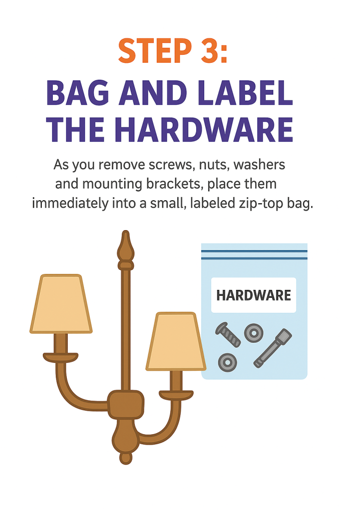 - Place them immediately into a small, labeled zip-top bag. A simple label like “HARDWARE” or “MOUNTING BRACKET” is perfect. For complex fixtures, you might use multiple bags labeled for specific arms. Tape this bag directly to the wrapped body of the chandelier or place it in a box you won’t lose.